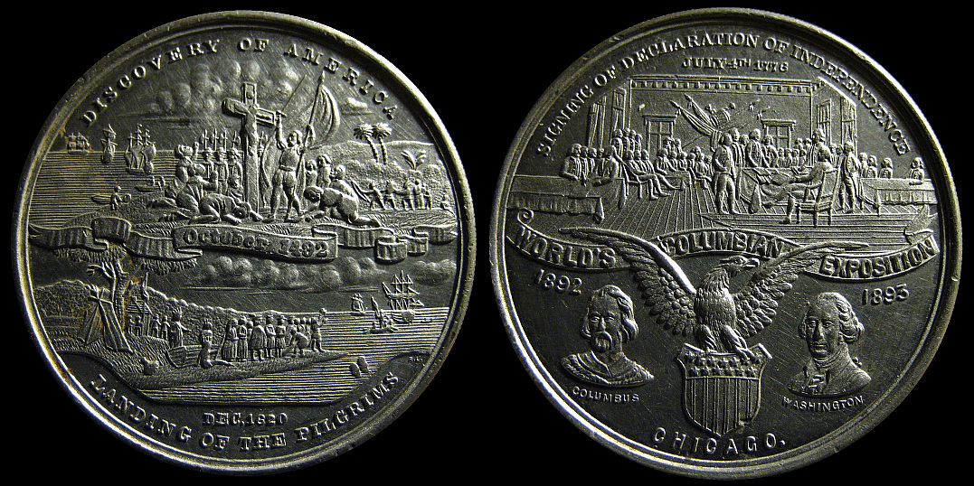 3) Scene depicting signing of Declaration of Independence. Eagle on shield below. Two small busts to the left and right of shield. Signing Of Declaration Of Independence July 4th 1776 around above. Worlds Columbian Exposition across middle. 1892 to the left. 1893 to the right. Chicago below. Rv: Landing scenes. Discovery Of America around above. October 1492 at center. Dec. 1620 Landing Of The Pilgrims below. /// Very Rare in Silver, Scarce in White Metal. Have also seen it described as Gold Plated and Copper Plated / 39.8 mm / SH6-30, HK156, HK157 Eglit36 (IMAGE)