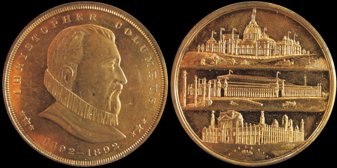 134) Bust left with beard and ruffled high collar. Christopher Columbus around above. 1492-Chicago, U.S.A.-1892 around below. Rv: Incuse reverse. /// Very to extremely rare in Bronze or Gilt Bronze / 35 mm / Like HK237 except the reverse is incuse. Kurt Krueger sale #55 lot#4741, and Rich Hartzog 9/4/84 sale lot#3057