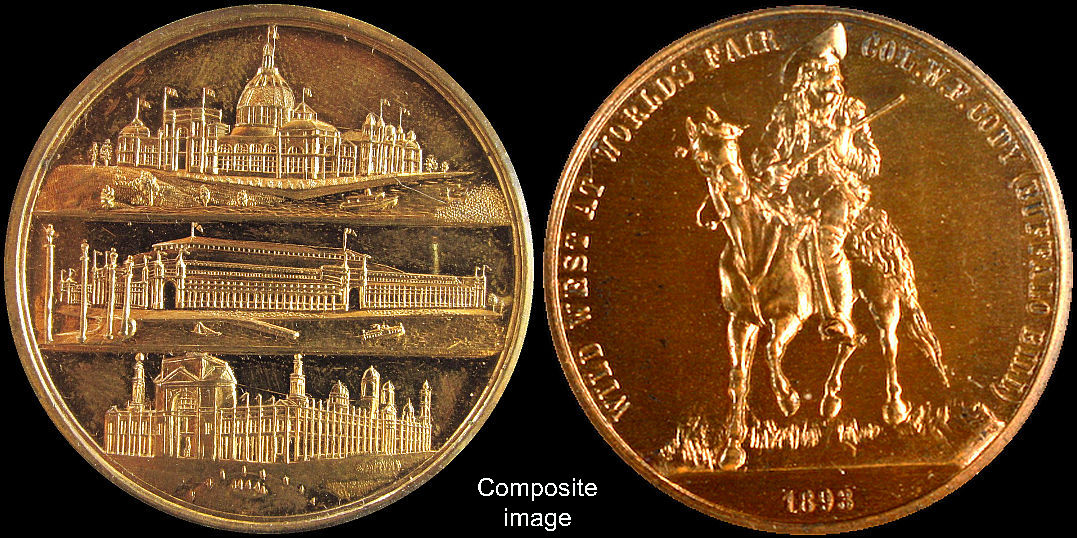 24) Ariel view of the fair. The Worlds Columbian Exposition above in one curved line and one straight line. Chicago, U.S.A. 1893 below in two lines. Rv: Man on horse with rifle. Wild West At Worlds Fair Col. W.F. Cody (Buffalo Bill) around above. 1893 below in exergue. /// Has been described as being in Aluminum, Brass, Bronze and Gilt Bronze. Very rare in any metal / 38 mm / Obverse HK167 combined with the reverse of Eglit361. Charles Kirtley sale #89 lot#2194 with picture. SH6-169 (IMAGE courtesy Randy Dobler)