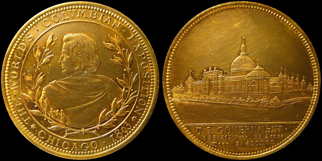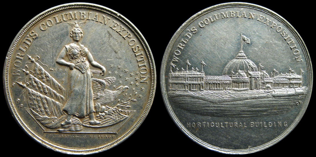 1) Building with central dome and flags. U.S. Govt. Building above in LARGE letters. Width 351 ft below in center arc. Length 421 ft Area 3.3 Acres at lower left and right. Rv: Treasury Department around above. United States Mint Exhibit around below. World's Columbian Exposition Chicago 1893 in five lines. /// Common in Brass(some look Gilt), very scarce in Silver Plate, extremely rare in Silver and Aluminum / 37.7 mm / SH6-1, HK154, Eglit23 (IMAGE)