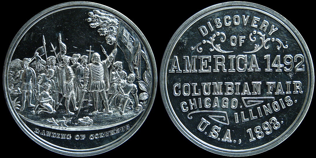 4) Scene depicting landing of Columbus. Landing of Columbus below around curve. C. Reinsch at base of landing scene in tiny lettering. Rv: Discovery Of America 1492 Columbian Fair Chicago. Illinois. U.S.A., 1893. /// Common, maybe scarce, Aluminum / 39.7 mm / SH6-33, HK158, Eglit17 (IMAGE)