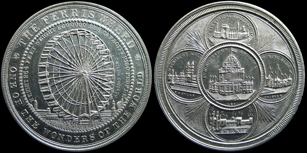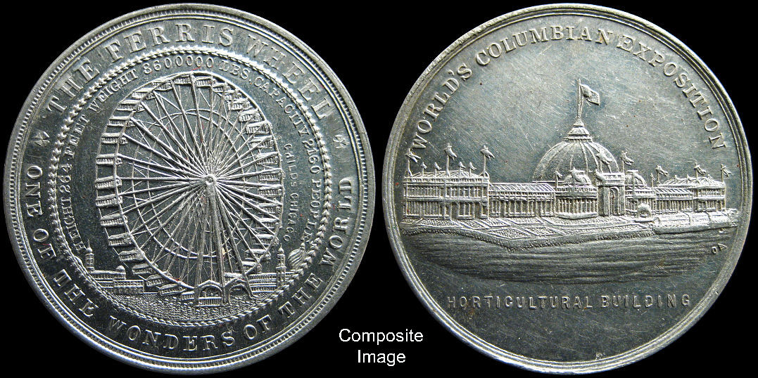 45) Ferris wheel. The Ferris Wheel above. One Of The Wonders Of The World around below. Height 264 Feet Weight 8600000 lbs. Capacity 2160 People around above within inner circle. Childs Chicago next to Ferris wheel to the right. Rv: Building with flags and dome. World's Columbian Exposition around above. Horticultural Building below. /// Scarce, Aluminum / 38.2 mm (measured) / SH6-15, HK172 (IMAGE)