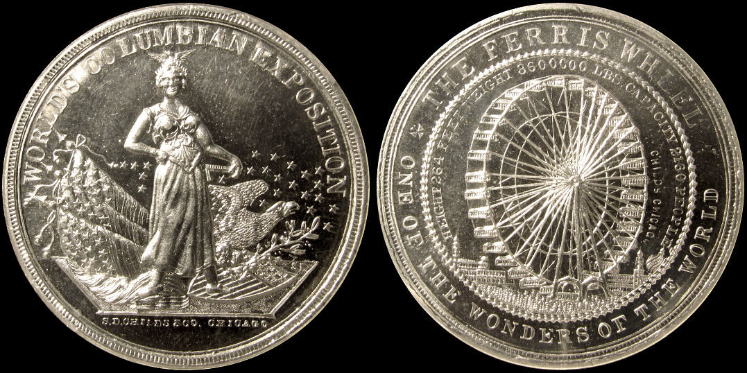 145) Bearded bust right with bow tie. Colonel Geo. R. Davis around above. Childs Chicago in tiny lettering to the lower left next to rim. Rv: Open wreath. Director General within wreath. World's Columbian Exposition around below. /// Rare, Aluminum. Eglit says this exists in Silver, but I have never run across one. / 38.2 mm (measured) / SH6-3, HK243b, Eglit53 (IMAGE)146) Two small busts. Souvenir Medal around above. World's Columbian Exposition Chicago around below. 1492 1898 above within inner circle. Columbus and C.W.G. Ferris above busts. The Ferris Wheel Dimensions in four curved lines. Height 264 Feet Weight 4300 Tons Capacity 2160 Persons Engines 2000 Horse Power below within inner circle. Rv: Ferris wheel within inner circle. Ferris Wheel around above. Greatest Mechanical Achievement Of The Age around below. /// Scarce / Aluminum / 38.1 mm / SH6-12, Eglit20. Neither side of this piece is pictured anywhere in HK. (IMAGE)