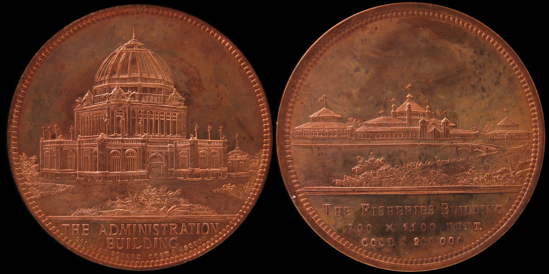 50) Building with dome. The Administration Building below. 260 Feet Square Cost $450,000 below in tiny print. Rv: View of buildings with flags. The Fisheries Building 200 X 1,100 Feet Cost $200,000 below in three lines. /// Very scarce in Aluminum. For whatever reason, I found none described as Brass. Extremely rare in Silver Plate. Extremely rare in Copper / Aluminum pieces probably all measure 35.6 mm with a reeded edge. Brass and Silver Plate pieces may all measure 35.3 mm with a plain edge / SH6-96, HK177a, HK177b (IMAGE)