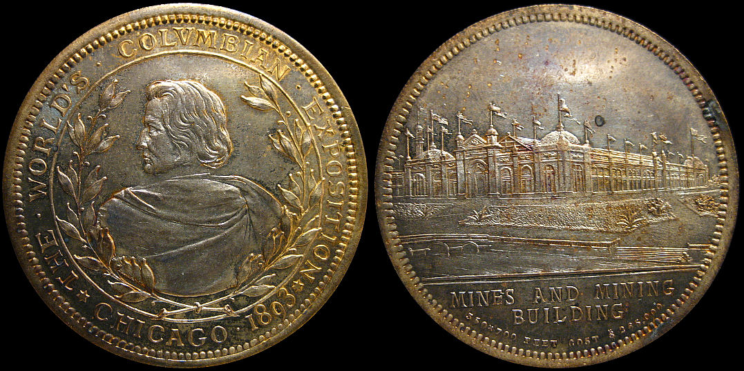 52) Columbus facing left within open wreath. The World's Columbian Exposition around above. Chicago 1893 below. Rv: Elaborate building with many flags. Mines and Mining Building below in two straight lines. 500 X 700 Feet Cost $265,000 in tiny lettering around below. /// Very scarce in Brass and Aluminum with Brass being slightly more common. Very rare in Silver Plate. Extremely rare in Copper. / 35.6 mm with all probably having a reeded edge / SH6-85, HK178, HK179, Eglit125 (IMAGE)