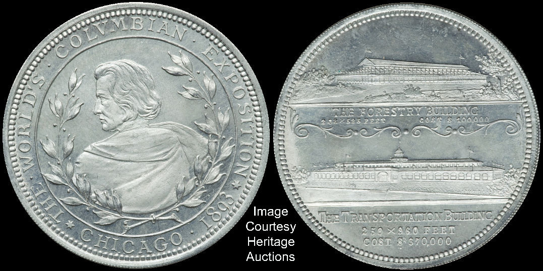55) Columbus facing left within open wreath. The World's Columbian Exposition around above. Chicago 1893 below. Rv: Two large long buildings, one above the other. The Forestry Building 208 X 525 Feet Cost $100,000 below upper building. The Transportation Building 250 X 960 Feet Cost $370,000 below lower building in three lines. /// Very scarce in Brass and Aluminum with Brass being slightly more common. Very rare in Silver Plate. Extremely rare in Copper. / 35.6 mm with all probably having a reeded edge / SH6-93, HK180, HK181, Eglit128 (IMAGE)