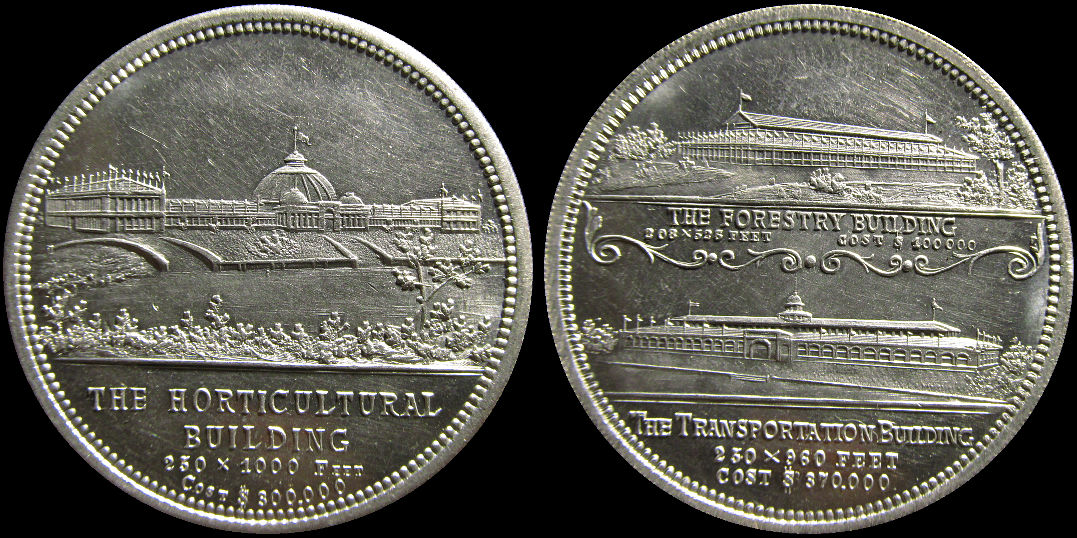 56) Long building with central dome. The Horticultural Building 250 X 1000 Feet Cost $300,000 below in four lines. Rv: Two large long buildings, one above the other. The Forestry Building 208 X 525 Feet Cost $100,000 below upper building. The Transportation Building 250 X 960 Feet Cost $370,000 below lower building in three lines. /// Very scarce in Aluminum. Rare in Brass. Extremely rare in Silver Plate. Extremely rare in Copper if in fact it exists at all. Be careful of worn pieces described as Bronze or Copper that could in fact be Brass. / Aluminum pieces probably all measure 35.6mm with a reeded edge. Brass and Silver Plate pieces may all measure 35.3 mm with a plain edge / SH6-101, HK181a (IMAGE)