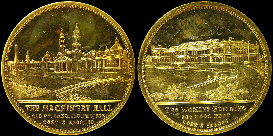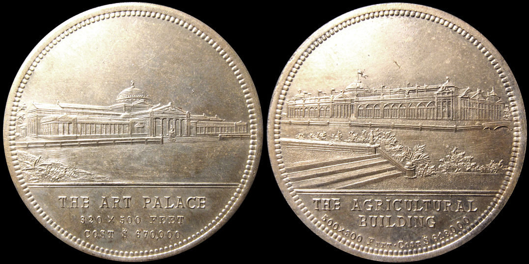 63) Building with two spires at center. The Machinery Hall 850 Ft. Long. 500 Ft. Wide Cost $1,200,000 below in three lines. Rv: Large rectangular building. The Womans Building 200 X 400 Feet Cost $120,000 below in three lines. /// Very scarce in Aluminum. Rare in Brass. Extremely rare in Silver Plate. Extremely rare in Copper if in fact it exists at all. Be careful of worn pieces described as Bronze or Copper that could in fact be Brass. / Aluminum pieces probaby all measure 35.6 mm with a reeded edge. Brass and Silver Plate pieces may all measure 35.3 mm with a plain edge / SH6-99, HK192, Eglit536 (IMAGE)