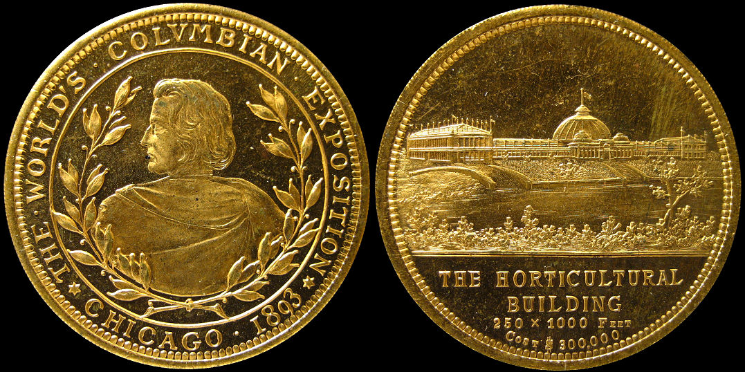 60) Columbus facing left within open wreath. The World's Columbian Exposition around above. Chicago 1893 below. Rv: Long building with central dome. The Horticultural Building 250 X 1000 Feet Cost $300,000 below in four lines. /// Very scarce in Brass and Aluminum with Brass being slightly more common. Very rare in Silver Plate. Extremely rare in Copper. / 35.6 mm with all probably having a reeded edge. / SH6-92, HK186, HK186a, HK187, Eglit124 (IMAGE)