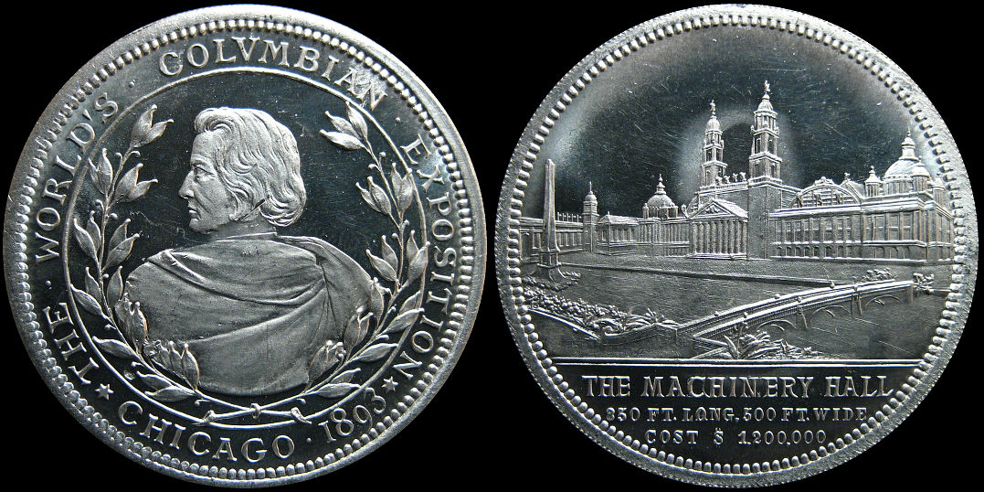 62) Columbus facing left within open wreath. The World's Columbian Exposition around above. Chicago 1893 below. Rv: Building with two spires at center. The Machinery Hall 850 Ft. Long. 500 Ft. Wide Cost $1,200,000 below in three lines. /// Very scarce in Brass and Aluminum with Brass being slightly more common. Very rare in Silver Plate. Extremely rare in Copper if in fact it exists at all. Be careful of worn pieces described as bronze or copper that could in fact be brass. / 35.6 mm with all probably having a reeded edge. / SH6-87, HK190, HK191, Eglit120 (IMAGE)