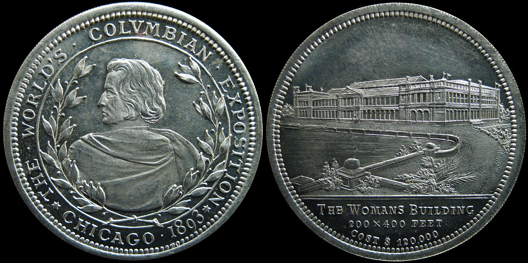 66) Columbus facing left within open wreath. The World's Columbian Exposition around above. Chicago 1893 below. Rv: Large rectangular building. The Womans Building 200 X 400 Feet Cost $120,000 below in three lines. /// Very scarce in Brass and Aluminum with Brass being slightly more common. Very rare in Silver Plate. Extremely rare in Copper if in fact it exists at all. Be careful of worn pieces described as Bronze or Copper that could in fact be Brass. / 35.6 mm with all probably having a reeded edge. / SH6-89, HK198, HK198a, HK199, Eglit129 (IMAGE)