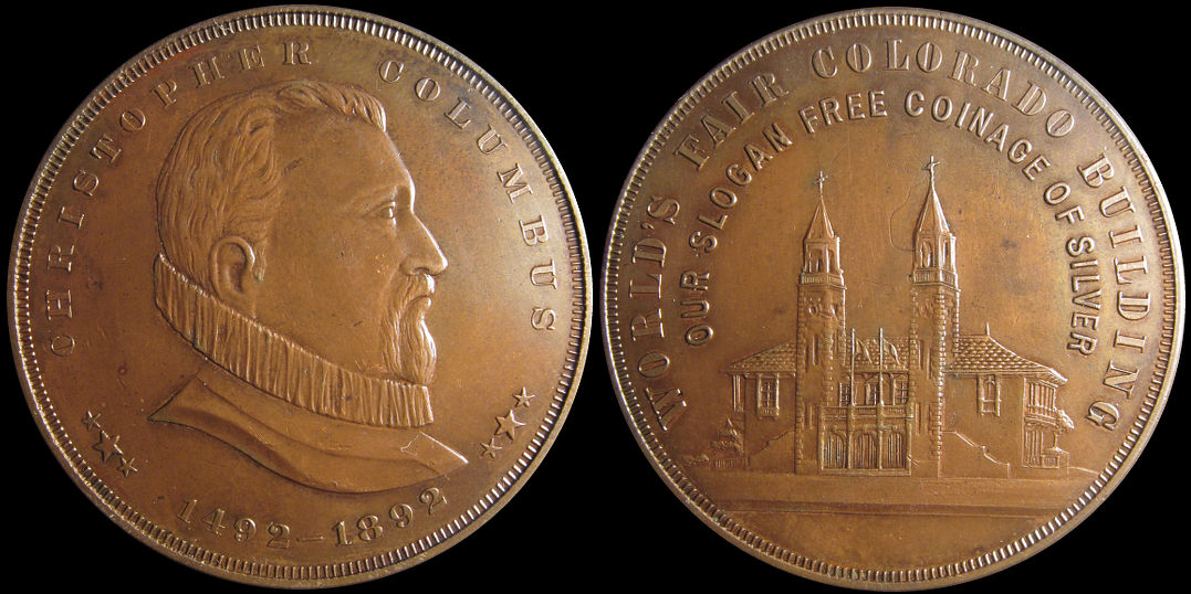 74) Bust right with ruffed high collar. Christopher Columbus around above. 1492-1892 below with three stars on either side. Rv: Building with two spires. World's Fair Colorado Building around above outside. Our Slogan Free Coinage of Silver around above inside. /// Rare, Aluminum. Very rare, Silver. Extremely rare in Bronze or Nickel. / 37.9 mm (measured) / SH6-142, HK210, HK1006; Eglit497 and Eglit497a (IMAGE)