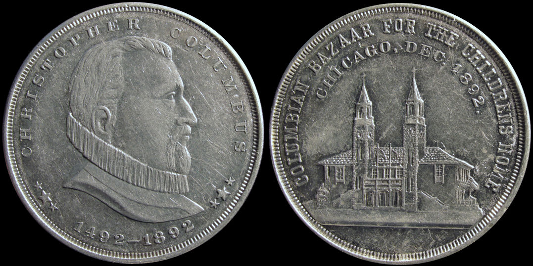 76) Bust right with ruffled high collar. Christopher Columbus around above. 1492-1892 below with three stars on either side. Rv: Building. Columbian Bazaar For The Childrens Home Chicago..... followed by dates, around above in two arcs /// Very rare, Aluminum / 38 mm / Obverse of HK210. Reverse the same as the reverse of HK210 but with a different legend. Charles Kirtley sale #104 lot#1554. SH6-146 (IMAGE)