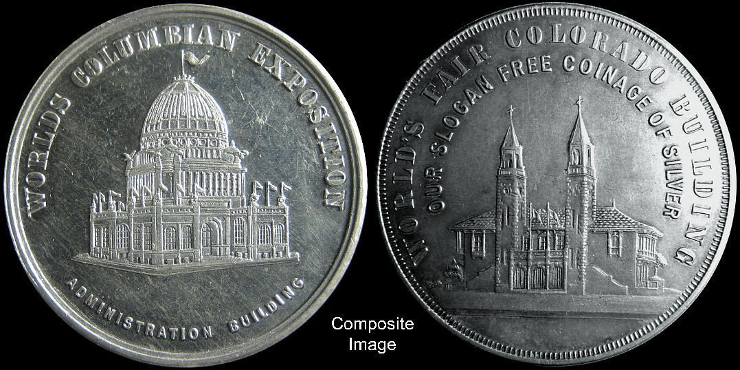 78) Corner view of building with central dome. Worlds Columbian Exposition around above. Administration Building around below. Rv: Building with two spires. World's Fair Colorado Building around above outside. Our Slogan Free Coinage of Silver around above inside. /// Very to extremely rare, Aluminum / 38 mm / SH6-147, HK210a in the second edition of HK (IMAGE)