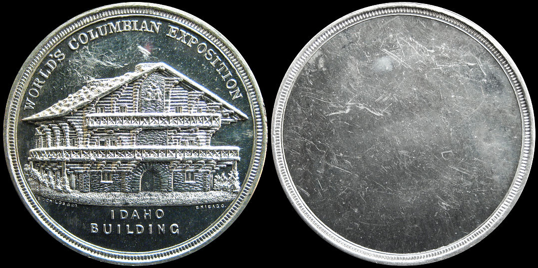 79) Log building with pitched roof, World's Columbian Exposition above around. Idaho Building in two straight lines below. S.D. Childs & Co. and Chicago. below to the left and right of building in microscopic lettering. Rv: Blank. /// Very rare in Aluminum. Extremely rare in White Metal / 38.3 mm (measured) / SH6-58, HK211, Eglit566 (IMAGE)