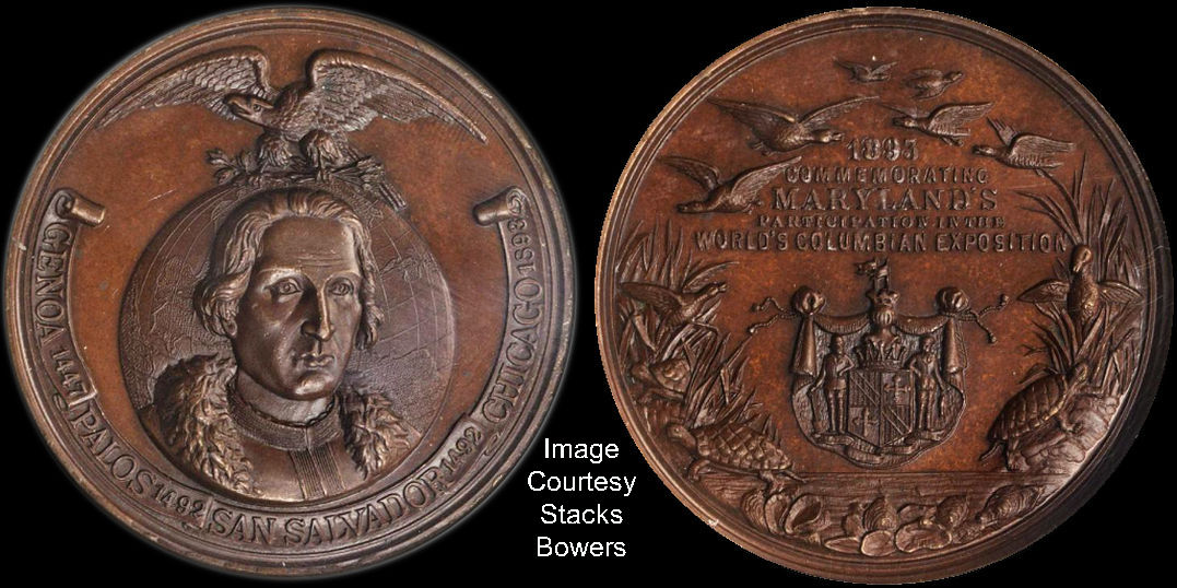 81) Bust on globe slightly right. Eagle above. Genoa 1447 Palos 1492 San Salvador 1492 Chicago 1893 on ribbon below around. Rv: Shield, birds and turtles. 1893 Commemorating Maryland's Participation In The World's Columbian Exposition in five lines. Copyright 1893 By Frank Brown Governor of Maryland below. /// Found in White Metal or Bronze. Very scarce in each metal. / 44.9 mm / SH6-61, HK213, HK213a, Eglit138 (IMAGE)