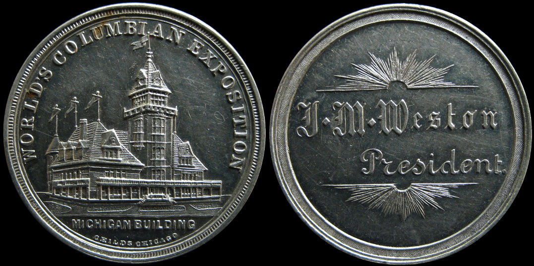 83) Building with flags. World's Columbian Exposition around above. Michigan Building below building. Childs Chicago around below in small lettering. Rv: Sunbursts above and below name. J.M. Weston President. in two straight lines. /// Very rare and considerably rarer than HK214 / Aluminum / 38.2 mm (measured) / The obverse of HK214 with a different reverse. SH6-65 (IMAGE)