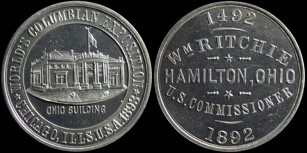 90) Building with flag within inner circle. World's Columbian Exposition around above. Chicago Ills. U.S.A. 1893 around below. Ohio Building below building in a straight line. Rv: 1492 Wm. Ritchie Hamilton, Ohio U.S. Commissioner 1892 in five lines. /// Very scarce, Aluminum / 35 mm / SH6-72, HK218, Eglit440 (IMAGE)