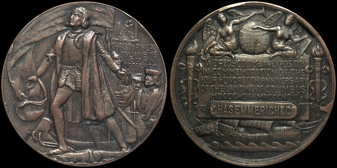 96) Standing figure with arms held out from side, Christopher Colvmbvs Oct XII MCCCCXCII at upper right. Rv: Central rectangle between two torches. Globe and two figures above. Worlds Columbian Exposition In Commemoration Of The Four Hundredth Anniversary Of The Landing Of Columbus MDCCCXCII MDCCCXCIII within rectangle. To Chas. Emmerich & Co. within lower part of rectangle. /// SH6-7.1, Die cracked reverse die. Rare, and rarer than the "C. Emmerich" variety, Copper / 38.4 mm (IMAGE courtesy John Wihlborg)