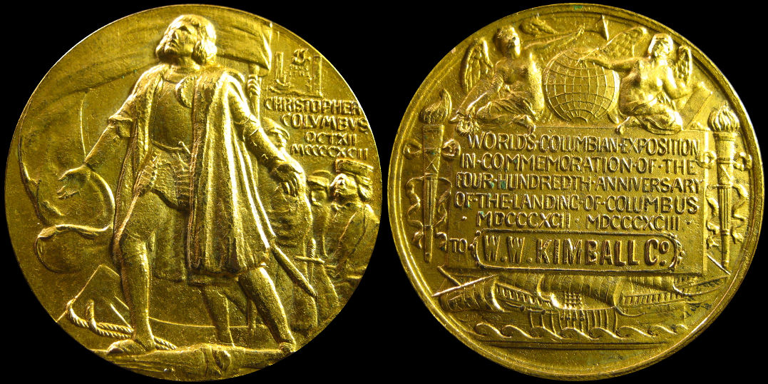 97) Standing figure with arms held out from side, Christopher Colvmbvs Oct XII MCCCCXCII at upper right. Rv: Central rectangle between two torches. Globe and two figures above. Worlds Columbian Exposition In Commemoration Of The Four Hundredth Anniversary Of The Landing Of Columbus MDCCCXCII MDCCCXCIII within rectangle. To W.W. Kimball Co. within lower part of rectangle. /// SH6-7.2. Very rare, Gilt / 38.2 mm (measured) / Obverse of HK223 but with a different name on reverse. (IMAGE)