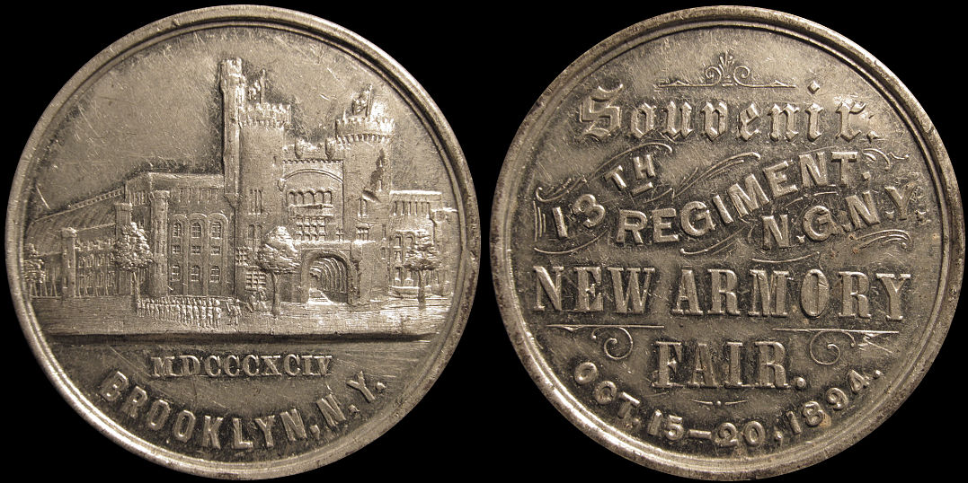 132) Souvenir from an 1894 Brooklyn, New York New Armory Fair. This imposing medieval structure still exists today at 357 Marcus Garvey Boulevard, between Putnam and Jefferson avenues. Very Rare, Aluminum, 38.2mm |