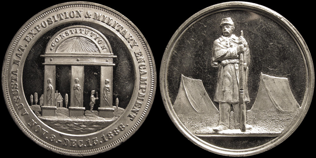 109) Commemorating the 1888 Augusta, Georgia National Exposition and Military encampment. The fair was a large, mostly industrial/agricultural fair. Extremely Rare, SH 5-41, White metal, 37.8mm   Find MILITARY ENCAMPMENT Medals and Tokens on ebay |