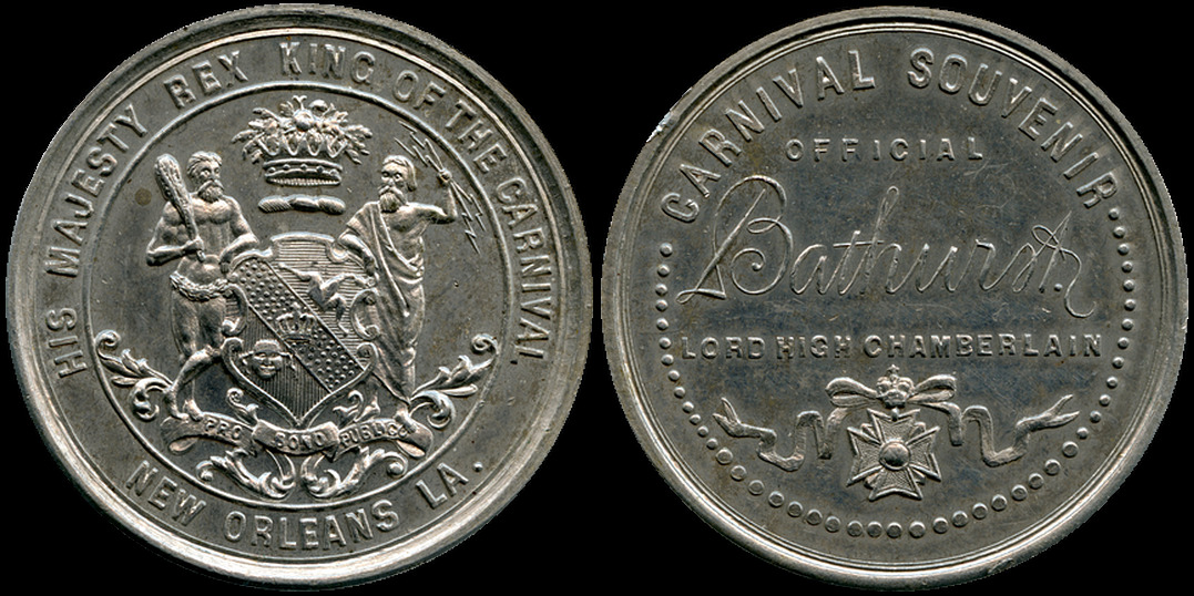 154c) Aluminum die variety of medal pictured in "Carnival Panorama-New Orleans Mardi Gras Medals and Krewes 1884-1965" by Jay Guren and Richard Ugan, 1966. There are a number of die differences of the medal shown here from the one in the book, one of which is that the book example appears to have 48 dots on the reverse, where as the one shown here has 45. The one in the book is described as white metal. The book states that it was probably minted between 1890 and 1917, but also states that the die work suggests it was minted at or just prior to the 19th century. There is evidently another variety from the 1890s that has been described as being made out of "pot metal". These medals were not made to be thrown to the crowds. The first "Doubloon throws" were issued in 1960( HK579-HK581). There is also a 1984 anodized aluminum throw version that has a similar obverse to the piece shown here, with the other side being a copy of the reverse of HK-143. Lastly there is evidently also a 2022/2023 version that is very similar to the piece shown here that can be distinguished, among other things, by the half circle of reverse dots being all of the same size. I found an early example (not pictured) in Stephen Alpert sale #38 Feb. 1991 lot#1582, described as an "early Mardi Gras medal", in aluminum, "circa 1900". Also look at #668 and #669 within the SEARCH PAGE of this website for two other unlisted pre 1960 so called dollar sized Mardi Gras medals. HK143 might also belong to this group. If anyone has more information, or perhaps more accurate information about any of these, let me know. Very to Extremely Rare, Found in aluminum or white metal. Aluminum, 36-37mm. Image courtesy Bryan Dennis. |