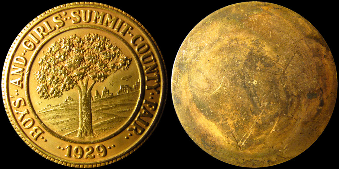 146a) From the 1929 Summit County fair, still held today in Tallmadge, Ohio, a suburb of Akron. The first fair was held in 1850. The piece shown here showed signs of having been glued on to something made of paper or cardboard. No sign of loop removal. Very Rare. Gilt bronze 34.2mm |