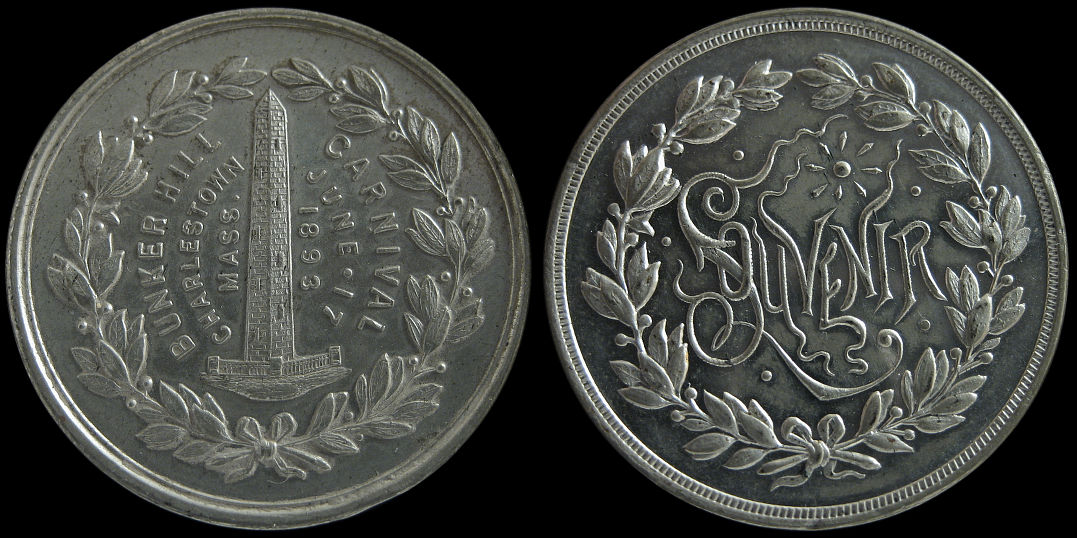 127) "Bunker Hill Charlestown Mass. Carnival June 17 1893". This piece combines the reverse of HK630 with a different obverse. I have only found it in bronze. Extremely Rare, Storer 994, Bronze, 37.7mm.   FIND CARNIVAL MEDALS on ebay |