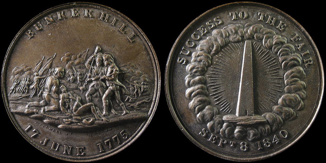 89) Commemorating a seven day "Ladies Fair" held in 1840 to raise money for the completion of the Bunker Hill Monument. Listed in DeWitt/Sullivan as WHH 1840-2.CLICK HERE or CLICK HERE(and scroll down) for more info. Found in bronze and white metal. Both bronze and white metal pieces are usually found in EF condition or lower, but there were evidently 21 copies struck in proof white metal circa 1860(Presidential Coin & Antique Co. Nov. 15, 1997 lot#1191) that might be nicer. Combining both bronze and white metal together - Rare, with perhaps the bronze ones being rarer than white metal. The white metal ones are sometimes holed. There are also three other varieties of this piece with the same battle scene depicted. Click Here for one. A second has the same battle scene but with "Battle Of Bunker Hill Death Of Gen. Warren 17 June 1775 Boston Mourns Her Gallant Son". It may have been stuck in 1875. The third piece is Dewitt No. WHH 1840-3. There is also an associated William Henry Harrison piece(Dewitt No.WHH 1840-4) that commemorates a Whig political jubilee that took place on Sept. 10th 1840 at the Bunker Hill ladies fair. On the piece shown here there are striations on the edge that look a bit like file marks, but I checked with the ANS in New York to see if their piece had the same striations, and it did. Dewitt No.WHH 1840-2. Bronze, 42.9mm. |
