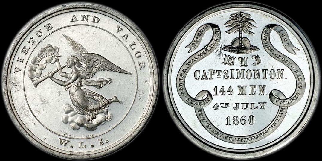 90) Souvenir from the participation of the Washington Light Infantry in an 1860 4th of July parade in Charleston, South Carolina. CLICK HERE for more info. Found in bronze and white metal. Very Rare in bronze. Very Rare in white metal. White metal, 38.6mm. Image Courtesy of Stacks Bowers Galleries www.stacksbowers.com   Shop for CIVIL WAR TOKENS and MEDALS on ebay |
