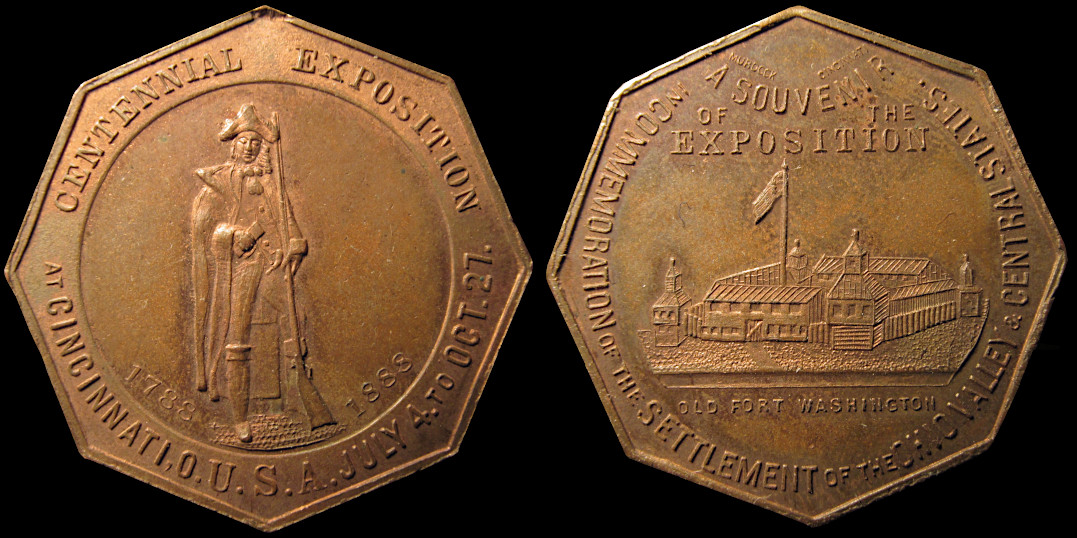 109d) Centennial Exposition Souvenir In Commemoration of the Settlement of the Ohio Valley and Central States. A tiny "Murdock Cincinnati" at the top reverse. Found in bronze and white metal. Strongly Rare in either metal and often found holed. From Kurt Krueger sale May 1986 lot #4693 in white metal described as "holed w/rope & miniature jug" Shevlin/Hyder SH 5-5. Bronze. 34.1mm corner to corner. 31.5mm side to side. |