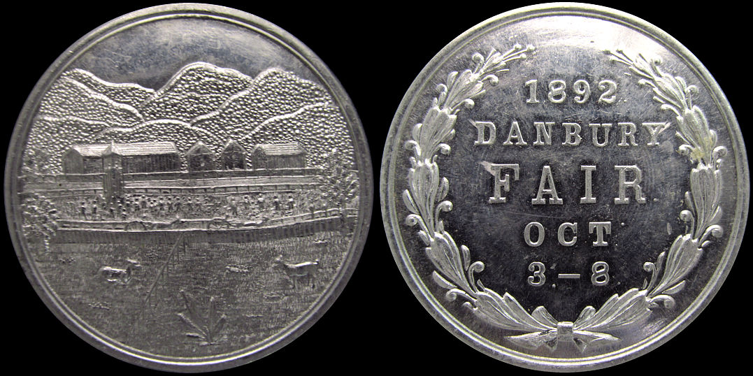 126) Obverse shows a rural farm scene. October 1892 Danbury Fair. May also be found in white metal. Holed about half the time. Rare, but Very Rare unholed. Aluminum, 39mm. From the collection of Dave Jensen. |