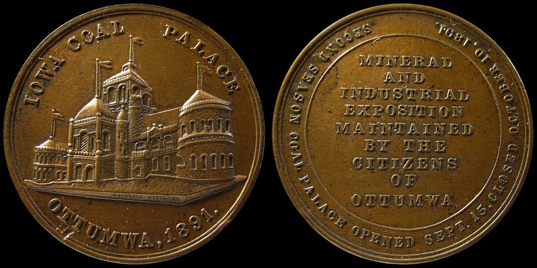 117) The Iowa Coal Palace housed an exposition in 1890 and 1891 promoting Iowa as a coal state, and was then dismantled shortly thereafter. "Second Season Coal Palace Opened Sept. 15, Closed October 10, 1891.". A variety of this piece uses "&" on the reverse in place of "and". I do not know which variety is rarer. Combining both varieties together, Rare, the vast majority of which are holed. Unholed ones are Very Rare, possibly Extremely so. I also found one piece from Paul Koppenhaver October 25, 1996 lot #524 that was described as being made of aluminum. Bronze, 37mm. |