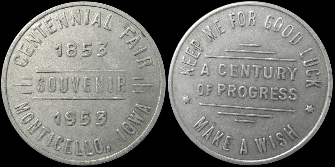 153) Souvenir from the 1953 Monticello Centennial Fair. A Century Of Progress. This is the only one of these I have come across. From the collection of Dave Jensen. Extremely Rare, Aluminum, 38.2mm |