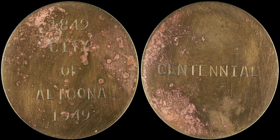 209b) A very plain commemorative from the 1949 Altoona, Pennsylvania Centennial celebration. No sign of loop removal. Very Rare, Plated copper, 43mm. Image courtesy Randy Dobler. |