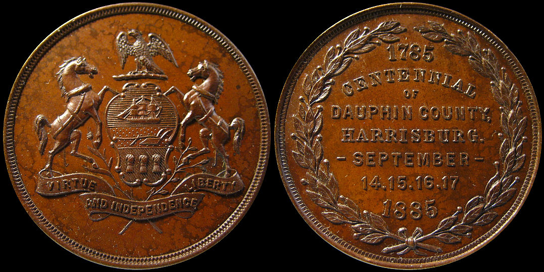 158) "1785 Centennial Of Dauphin County, Harrisburg.-September-14.15.16.17 1885". The same coat of arms as #163 and #165 below. Also exists in white metal. Very Rare in white metal. Extremely Rare in bronze. Bronze 37.6mm.   |