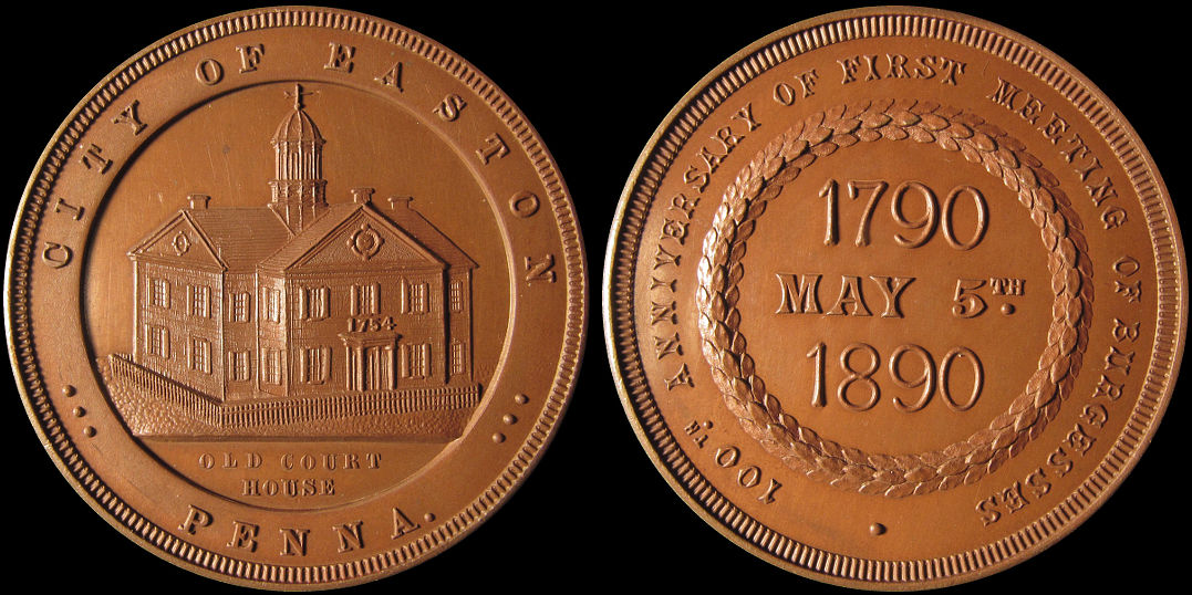 171) "City Of Easton Penna. / Old Court House" "100th Anniversary Of First Meeting Of Burgesses / 1790 May 5th. 1890". Similar to HK618. Can be found in white metal or bronze. Very Rare in white metal, and always? holed, Extremely Rare in bronze, 38mm.   |