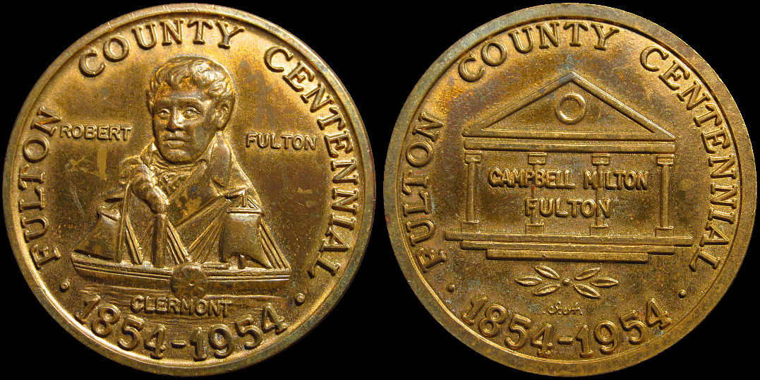 213) "Fulton County Centennial 1854-1954". A small so called dollar, just a shade under 33mm in diameter. Rare. Brass, 32.9mm |
