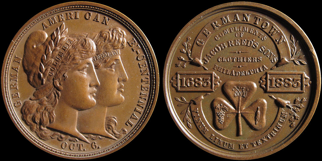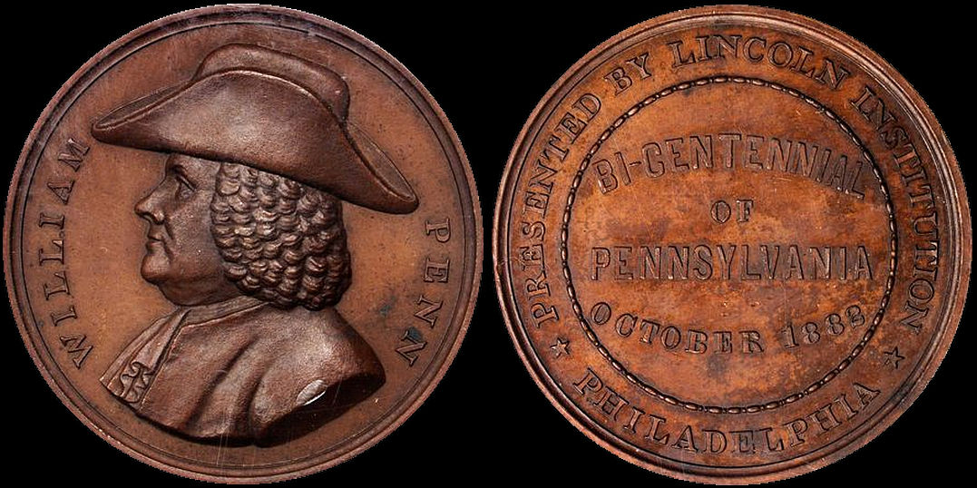 157) The same obverse as HK140, but with a different reverse. Commemorating the 1882 bi-centennial of Pennsylvania. The only ones that I have seen are this one in bronze and another in white metal that was holed with a 1682/1882 brass pin back. Extremely Rare in either metal, Bronze, 35mm. Image Courtesy of Stack’s Bowers Galleries www.stacksbowers.com   |
