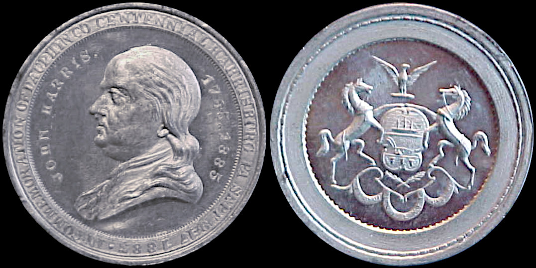 160a) A fourth! 1885 Dauphin County Harrisburg Centennial medal, this one depicting John Harris, a frontiersman and early settler of Harrisburg. Tiny "EAK" under bust(Edward A. Kretschman). Compare to #157c above. The portrait of John Harris on this medal, evidently engraved by Edward Kretschman, is VERY similar to the Ben Franklin portrait of #157c, evidently done by George Morgan. On the internet I cannot find an actual picture of John Harris, so perhaps there isn't one. Maybe the engraver of this medal decided to partly copy the Ben Franklin engraving by Morgan as a best guess? Very Rare, White Metal, 35mm. Image courtesy of Terry Hess.   |