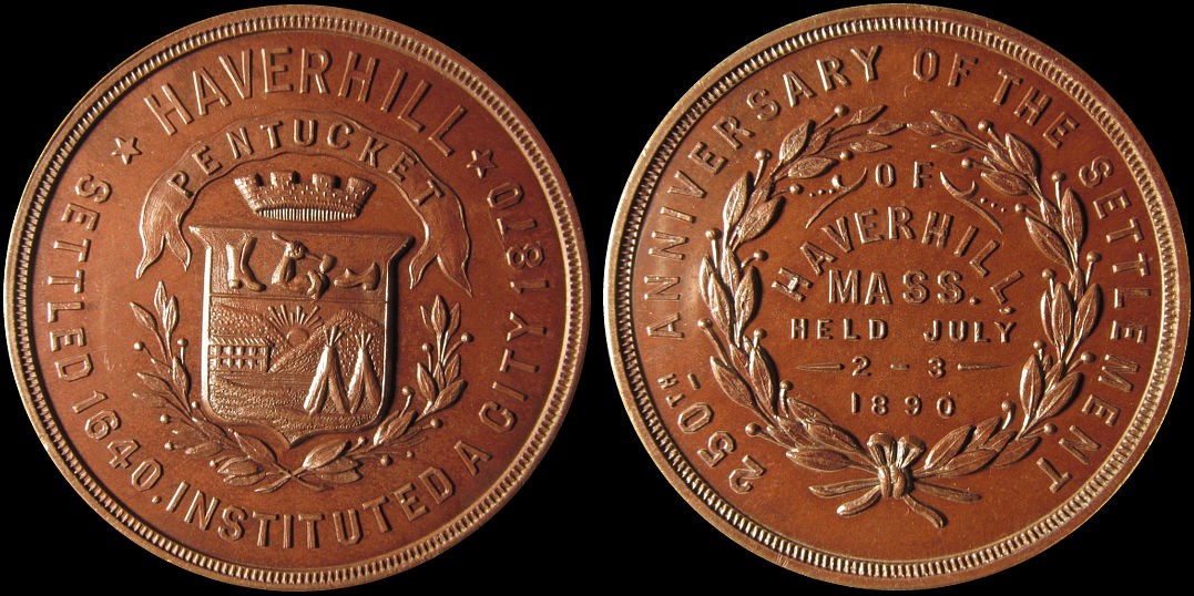 170) "250th Anniversary Of The Settlement Of Haverhill Mass.". Very Rare in white metal, and often holed. Extremely Rare in bronze. Bronze, 37.7mm.   |