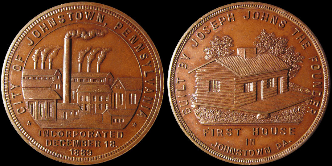 169) On December 18, 1889 the borough of Cambria officially joined the city of Johnstown to form the newly incorporated town of Johnstown, Pennsylvania. The catastrophic Johnstown flood occurred earlier that year on May 31st, killing 2,200 people. Very Rare, and I have only found it in bronze. It is sometimes found with a clamped on loop with hanger. Bronze, 37.7mm   |