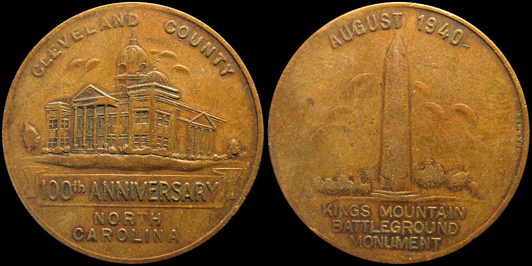 208) Commemorating the 100th anniversary of Cleveland County, North Carolina. Kings Mountain Battle Monument on the reverse. August 1940. Rare. Bronze, 32.6mm(barely makes so called dollar size)   |