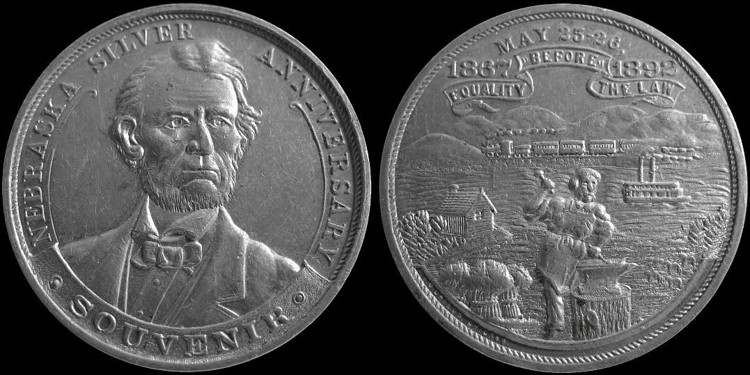 176) From the 1892 "Nebraska Silver Anniversary", Rare but holed maybe half the time. Aluminum, 37mm.   |