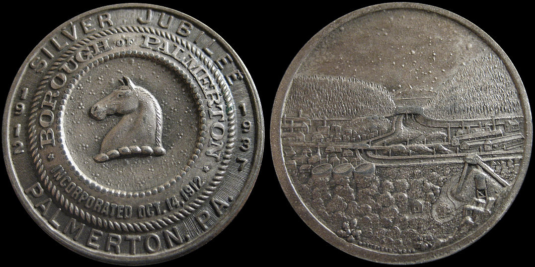 203) "Silver Jubilee Palmerton, Pa.", "Incorporated Oct. 14, 1912". "Whitehead-Hoag" in tiny lettering next to rim. Very Rare, and occasionally found with a fob loop. White metal, 38.6mm. |