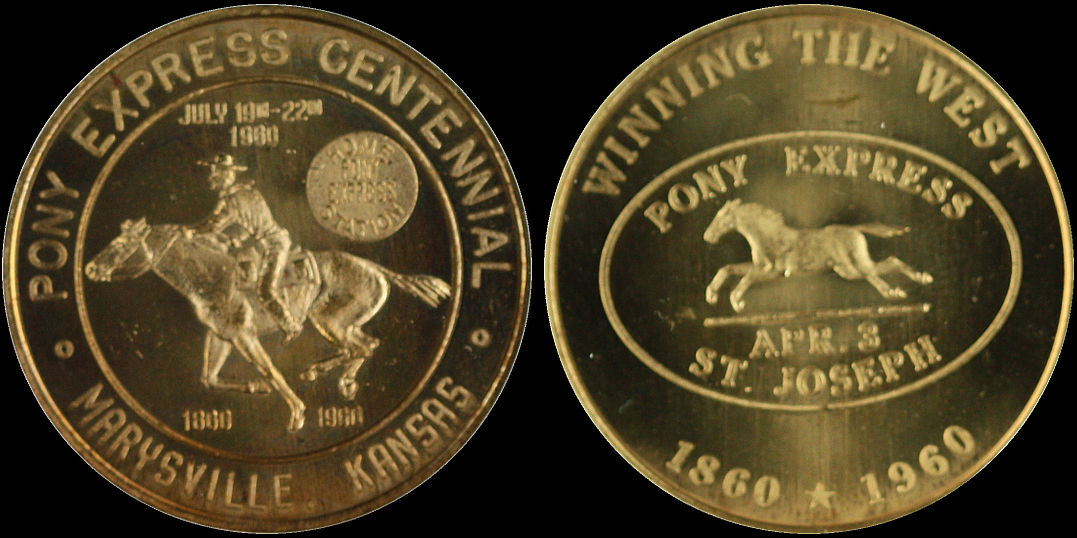 221) Like HK-585 but with a different obverse. "Marysville Kansas July 19th-22nd 1960" and "Home Pony Express Station" within small circle. NGC has included this piece as HK-585a. Considerably rarer than HK-585. Very Rare, 34mm. Image courtesy of Randy Dobler. |