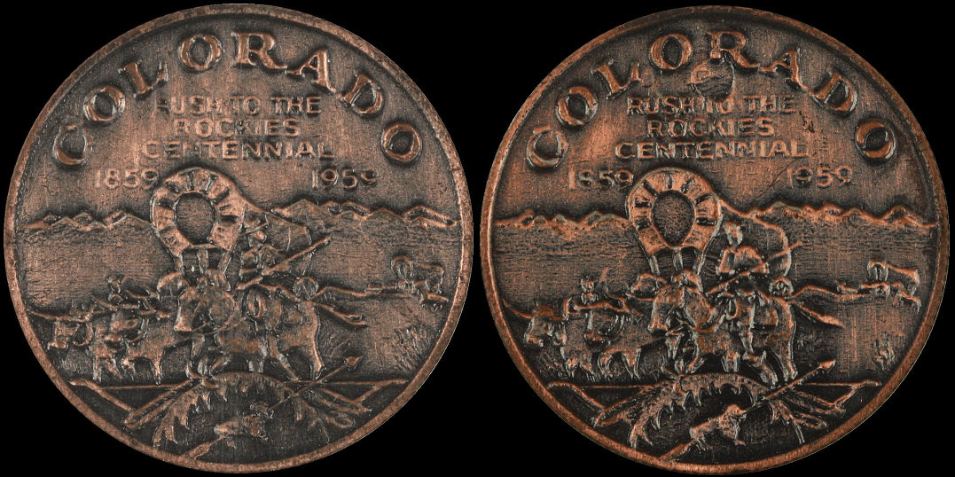 217b) A cast double sided Rush To The Rockies Centennial medal. It appears to come with or without a loop. I own one of these that is looped and with a reeded edge, with the reeded edge showing an obvious line running circumferentially around it's middle which would indicate a casting. Being that the edge is reeded, one would assume that there may be an original die struck piece, at least one sided, but I have never seen one as such. It is very similar to HK544, but different. Very Rare. Oxidized bronze, 38mm. Image courtesy Randy Dobler |