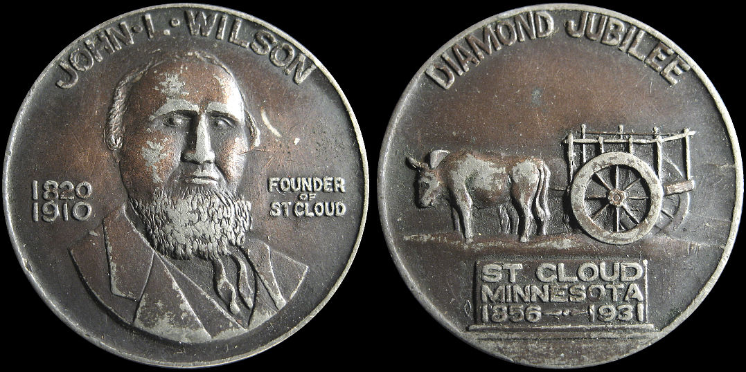 195) "Diamond Jubilee / St Cloud Minnesota 1856-1931", "John L Wilson", Very Rare. Some sort of white metal/pot metal, 33.4mm. |