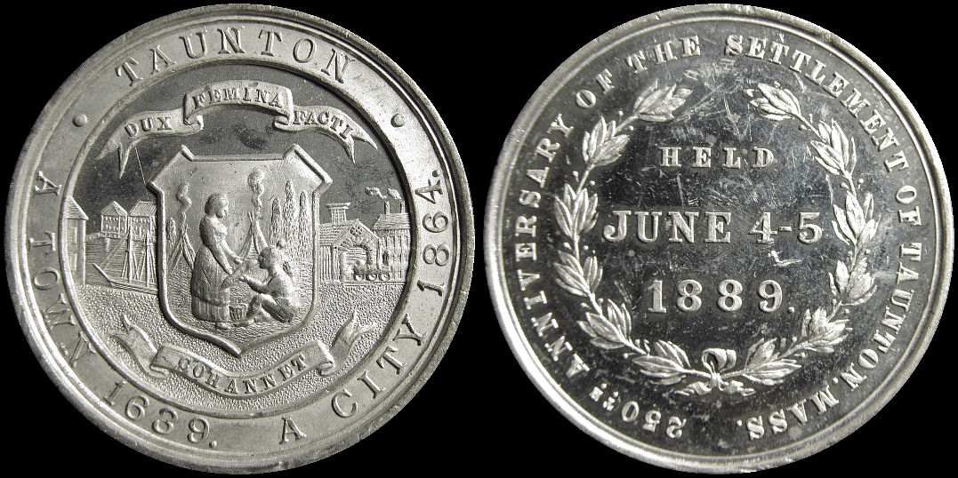 167) "250th Anniversary Of The Settlement Of Taunton. Mass.". I have only located it in white metal. Listed in Rulau as Ma-Tn 5a. Very Rare and sometimes holed. White metal, 38mm.   |